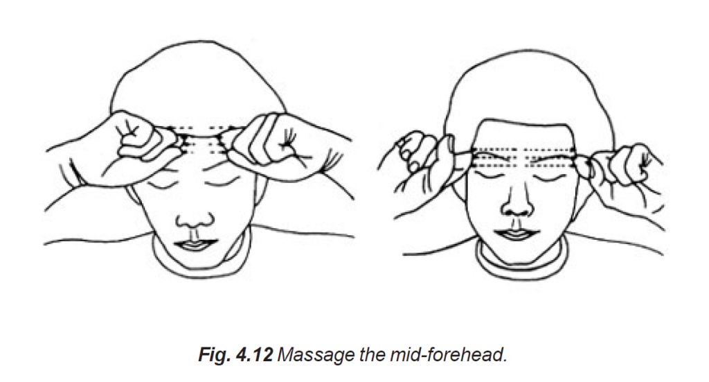 Use the second joint of alternate index fingers to massage the middle of the forehead, from the center to the temple. (Fig. 4.12)
